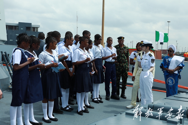 當(dāng)?shù)貢r(shí)間2024年5月27日,中國海軍第46批護(hù)航編隊(duì)在尼日利亞舉行開放活動(dòng),當(dāng)?shù)貙W(xué)生上艦參觀。(攝影/梁杰培)