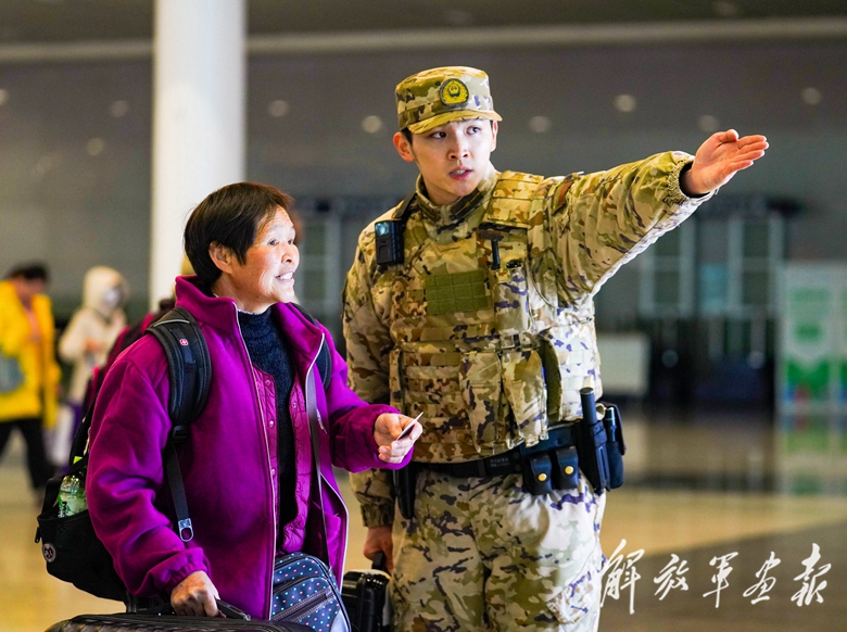 春運(yùn)期間,一名擔(dān)負(fù)執(zhí)勤任務(wù)的武警少尉在杭州東站為群眾指路。(攝影/韓敏捷)