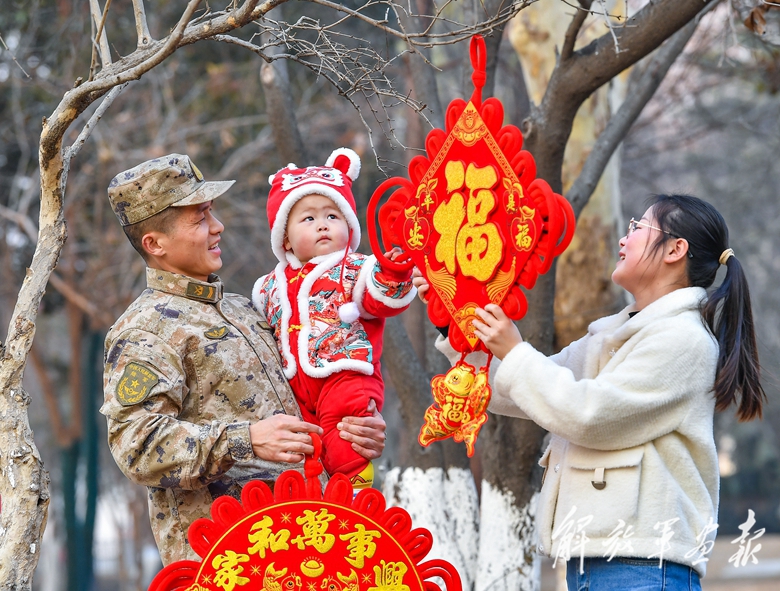 春節(jié)前夕,陸軍第71集團(tuán)軍某部軍士與來(lái)隊(duì)探親的妻兒共享溫馨時(shí)光。(攝影/林蔚鴻)