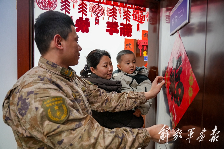 信息支援部隊(duì)某旅軍士與來(lái)隊(duì)探親的妻兒一同布置宿舍,共賀新春。(攝影/鄧博群)