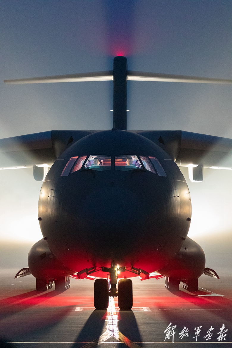 滑行、加速……夜色中,伴隨著聲聲“咆哮”,運(yùn)-20騰空而起。