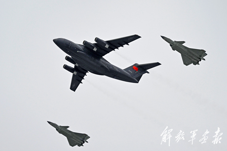 2024年11月28日,該團(tuán)運(yùn)-20飛機(jī)執(zhí)行接運(yùn)第十一批在韓中國人民志愿軍烈士遺骸回國任務(wù)。圖為運(yùn)-20專機(jī)在兩架殲-20伴飛護(hù)航下,抵達(dá)沈陽桃仙國際機(jī)場上空。(攝影/余紅春)
