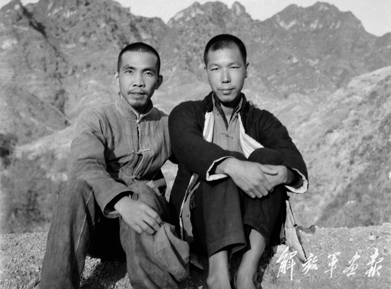 1943年秋季反“掃蕩”期間,沙飛(左)、石少華帶領(lǐng)晉察冀畫報社的同志們在阜平花塔山打游擊時的合影。