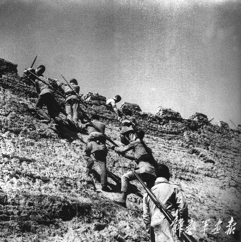 1945年,在收復(fù)河北省獻(xiàn)縣戰(zhàn)斗中,冀中部隊突擊組戰(zhàn)士奮勇登城。(攝影/梁明雙)