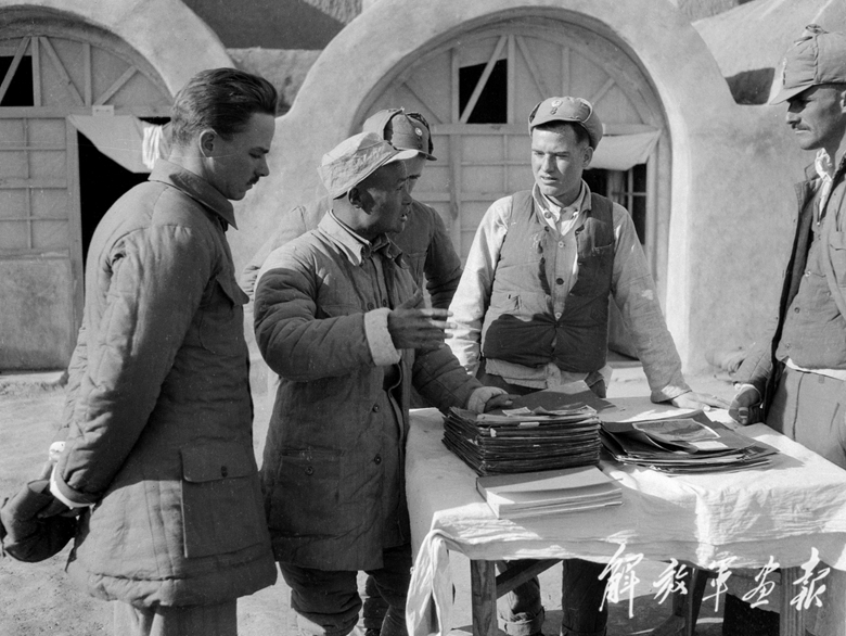 1944年,河北阜平洞子溝,晉察冀畫報社向前來參觀的美軍觀察組贈送照片。(攝影/石少華)