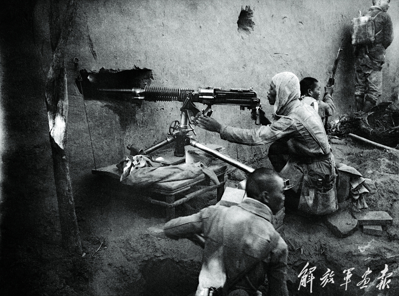 1948年,東北野戰(zhàn)軍發(fā)起遼沈戰(zhàn)役。圖為解放軍在重機槍的掩護(hù)下,在義縣城內(nèi)與國民黨軍隊進(jìn)行巷戰(zhàn)。(攝影/齊觀山)
