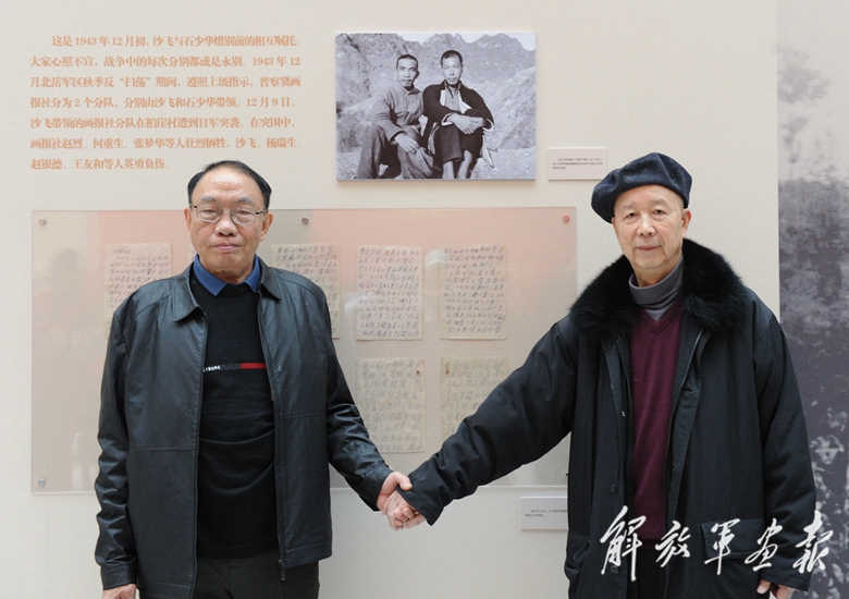 展覽現(xiàn)場,紅色攝影家沙飛之子王毅強(左)與石少華之子石志民在父輩的合影照片前聚首。
