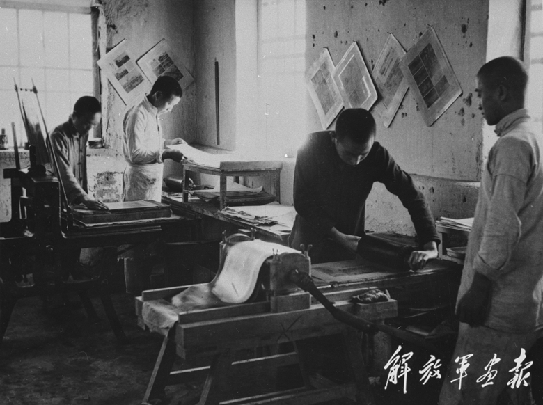 1943年,晉察冀畫報社工人用自制的輕便印刷機印制《晉察冀畫報》。(攝影/沙 飛)
