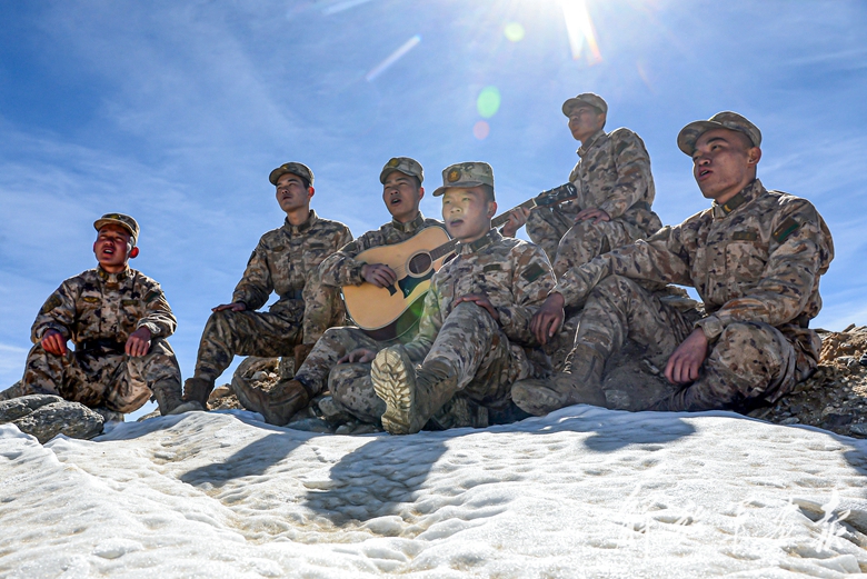 休息時,官兵放聲歌唱《我為祖國守邊關》。