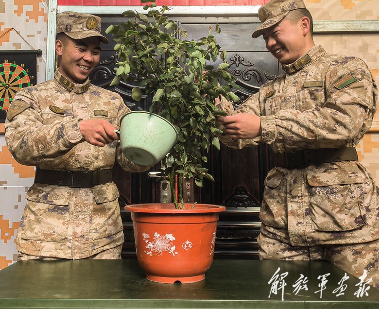 官兵精心養(yǎng)護綠植,改善哨所環(huán)境。