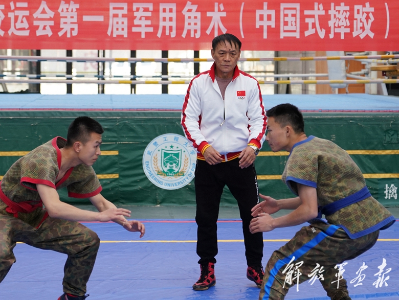 冬日,武警工程大學軍事體育運動會正在如火如荼地進行。軍用角術(中國式摔跤)比賽現(xiàn)場比拼激烈,吸引了很多官兵觀戰(zhàn),場上你爭我奪互不相讓、場下吶喊助威聲此起彼伏。
