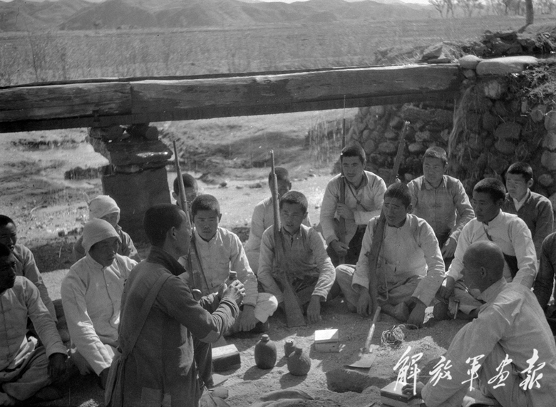 民兵們?cè)趹?zhàn)斗間隙交流埋設(shè)地雷的經(jīng)驗(yàn)。(本刊資料室提供)