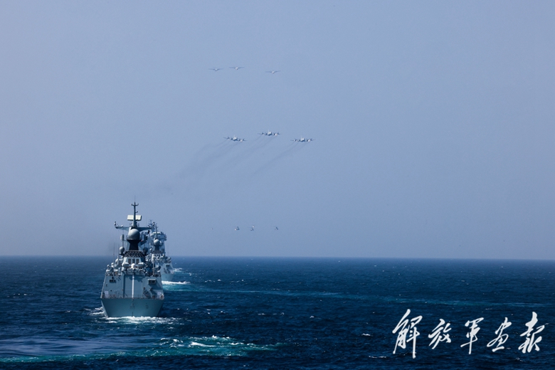 海上編隊(duì)航行中,戰(zhàn)機(jī)低空飛行。