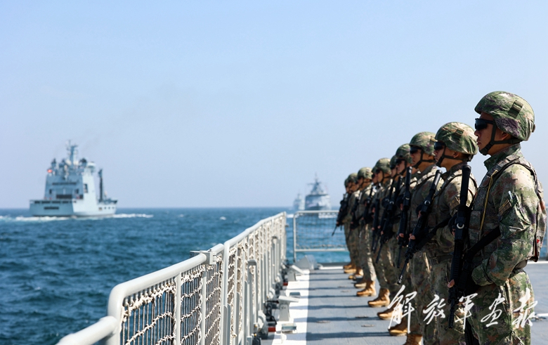 在實(shí)兵演習(xí)后舉行的國際閱艦式上,中方參演官兵在甲板上列隊(duì)受閱。