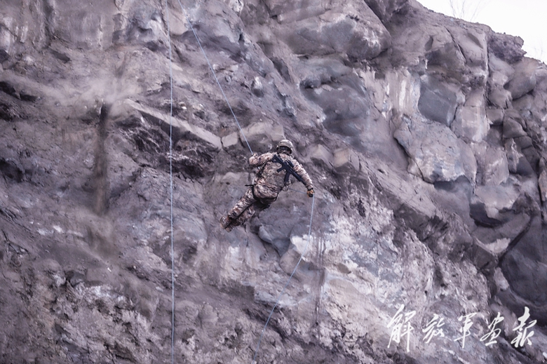 火力組抵近目標(biāo)地域時(shí),一道高聳的崖壁橫亙眼前?!敖惶嫜谧o(hù),滑降通過!”組長周傳輝迅速系好繩索,借助慣性穩(wěn)穩(wěn)落至崖底。其余偵察隊(duì)員依次交替掩護(hù),順利通過斷崖。