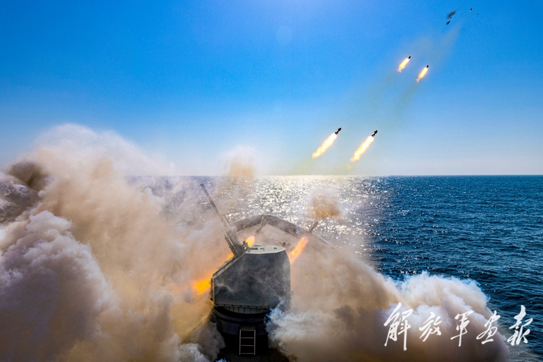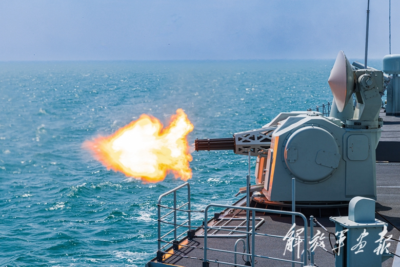 “開(kāi)火!”邯鄲艦鎖定目標(biāo)后,立即對(duì)“敵艦”發(fā)起攻擊。霎時(shí)間,海面炮聲隆隆,硝煙彌漫。