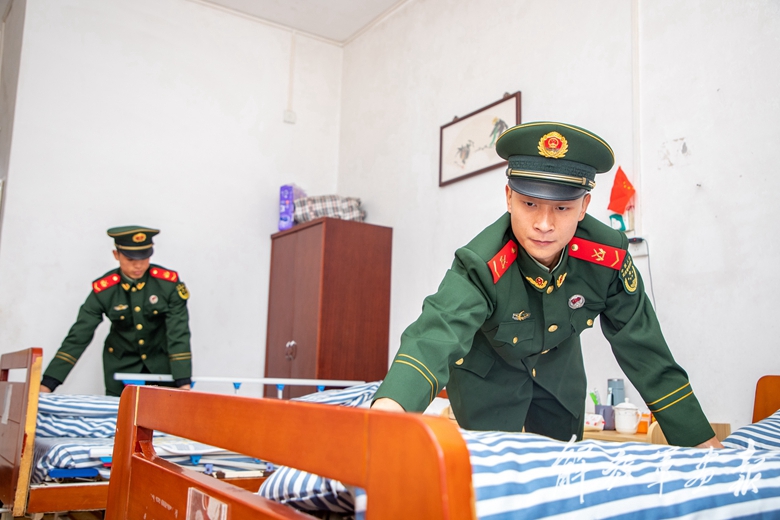 2月27日,武警廣西總隊北海支隊官兵走進(jìn)駐地敬老院開展學(xué)雷鋒活動,為老人們送去溫暖與關(guān)懷。圖為官兵幫助老人打掃衛(wèi)生,整理床鋪。(攝影/劉 堅)