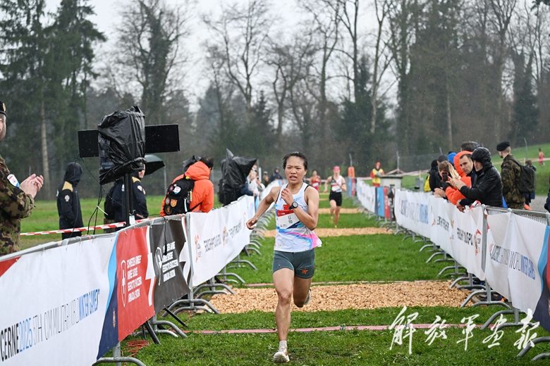 當?shù)貢r間3月26日,我軍選手李百慧在女子越野跑比賽中沖向終點。