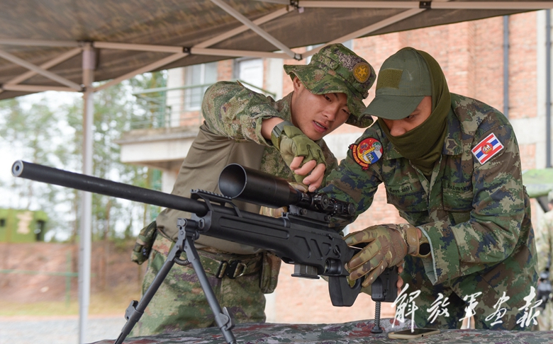 中泰雙方參訓(xùn)隊(duì)員交流狙擊槍操作方法。(攝影/記者 肖 曄)