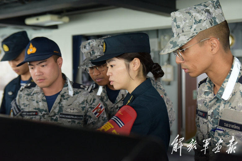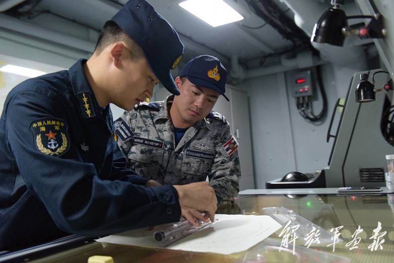 中泰雙方參訓(xùn)隊(duì)員交流艦操圖繪算方法。(攝影/記者 肖 曄)