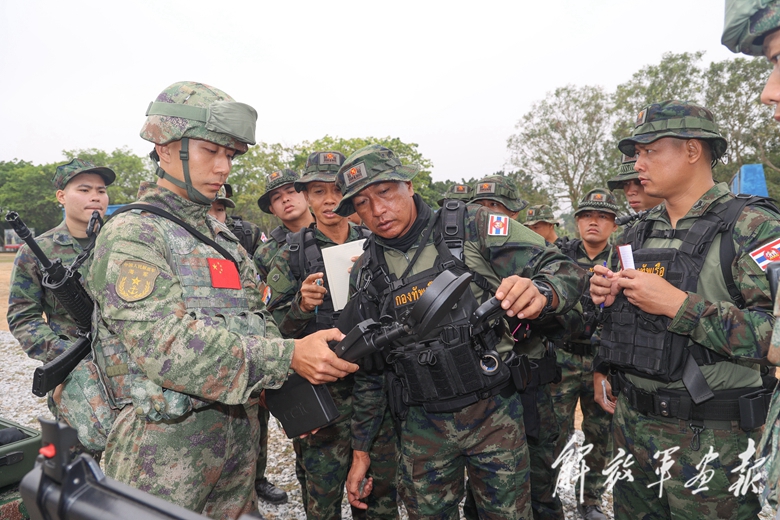 中方參訓(xùn)隊(duì)員向泰方參訓(xùn)隊(duì)員展示搜排爆裝備。(攝影/高國敬)