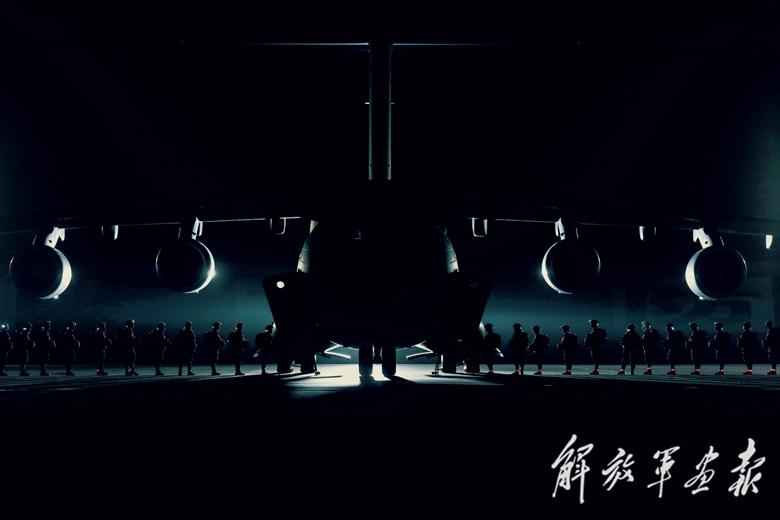 夜晚,停機坪燈火通明,機務人員緊張忙碌,為夜間空投空降訓練做準備。“起飛!”隨著塔臺指揮員下達指令,多架飛機再次騰空而起,投入下一輪訓練……
