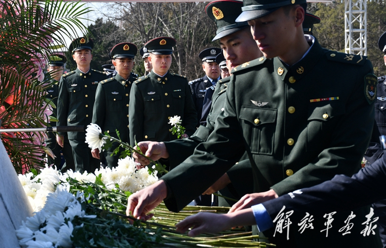 官兵代表向烈士紀(jì)念碑獻(xiàn)花。