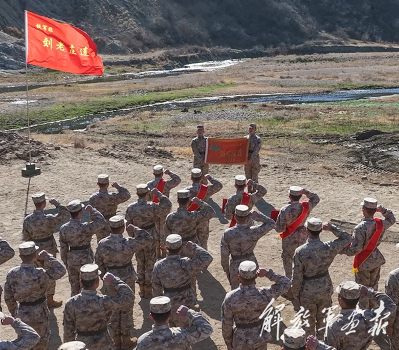 “劉老莊連”官兵在駐訓(xùn)地開展向連旗宣誓活動(dòng)。