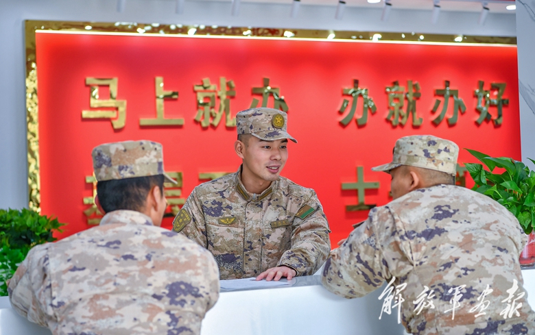 惠兵服務(wù)大廳工作人員(中)為官兵提供服務(wù)。