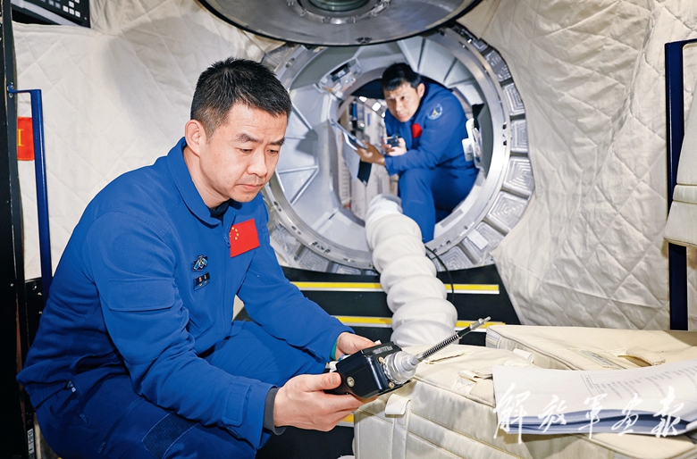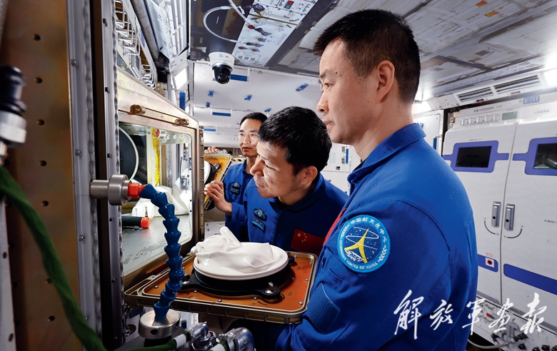 神舟二十號航天員乘組(從前至后:陳冬、王杰、陳中瑞)進行在軌實驗操作訓(xùn)練。(攝影/徐 部)