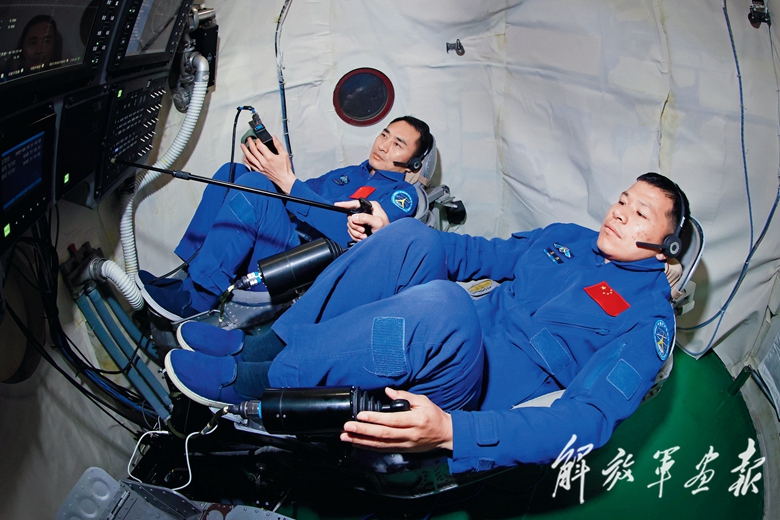 神舟二十號航天員陳冬(前)、王杰(后)在貨運飛船模擬艙內(nèi)訓(xùn)練。(攝影/徐 部)