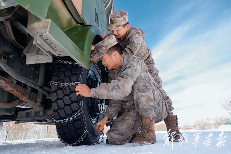 行至冰雪路段,司乘人員合力為車輛安裝防滑鏈。