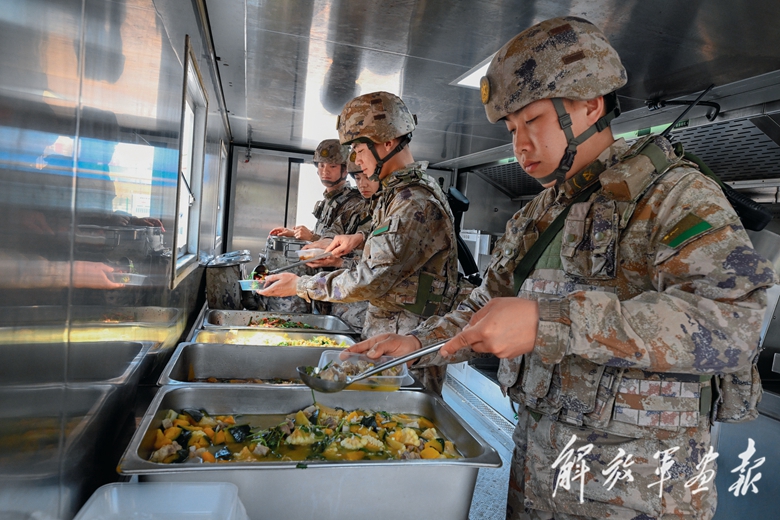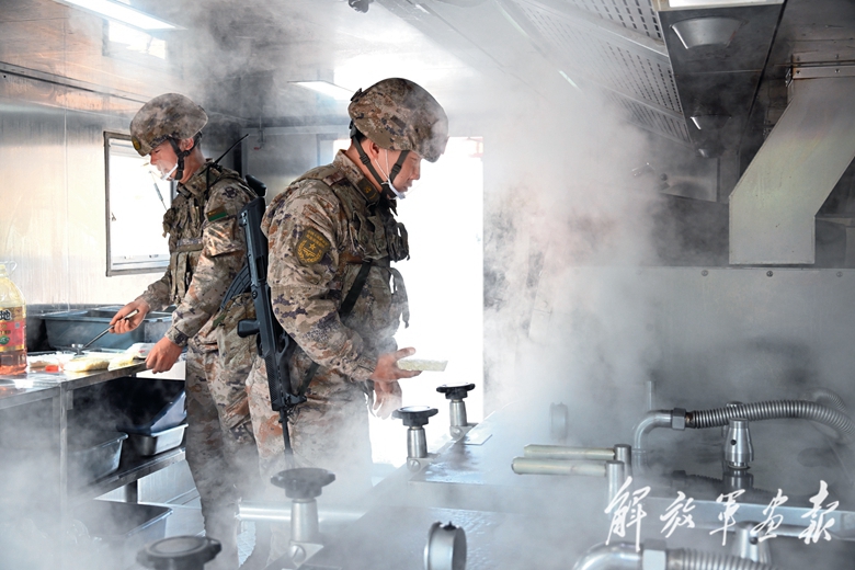 接到保障命令后,官兵們迅速攜帶裝具、裝備、戰(zhàn)斗物資出發(fā)。抵達目標(biāo)地域后,一套基地化熱食快餐保障系統(tǒng)快速展開。搬運、和面、備菜、倒油……官兵反應(yīng)迅速、動作麻利,在“移動廚房”內(nèi)外有條不紊地作業(yè)。1個多小時后,官兵完成了米飯、包子、回鍋肉、土豆燒牛肉等主食和菜品的制作分裝。