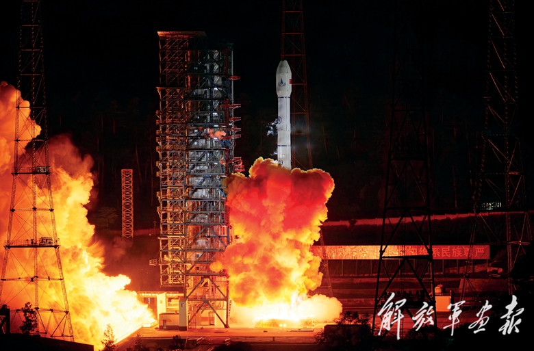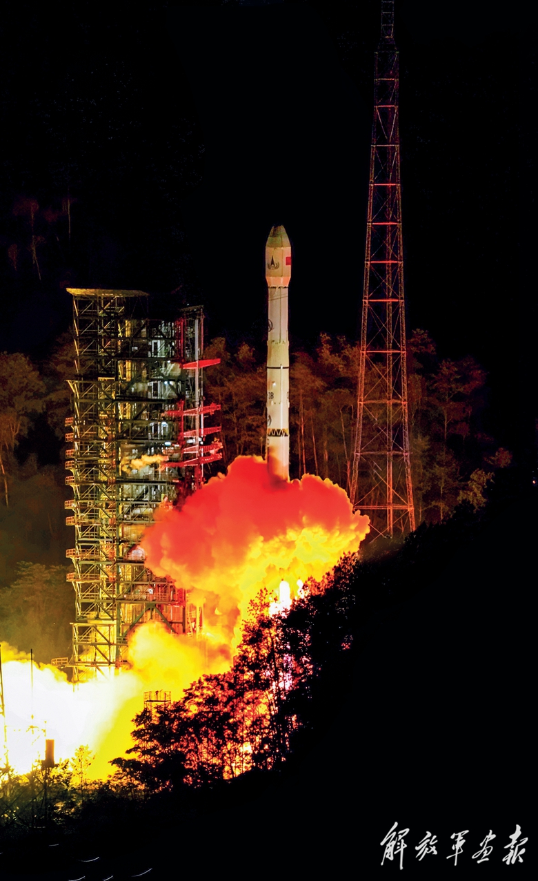 長征三號乙遙一一〇運(yùn)載火箭點(diǎn)火發(fā)射瞬間。(攝影/記者 劉 丹)
