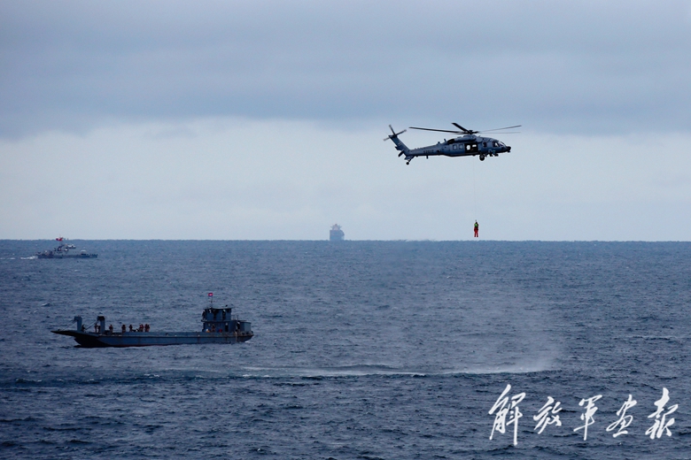 5月26日,海空方向?qū)嵄菥氃谖鞴烁鄹浇S蚺e行,參演的中方直升機搜救落水“傷員”。