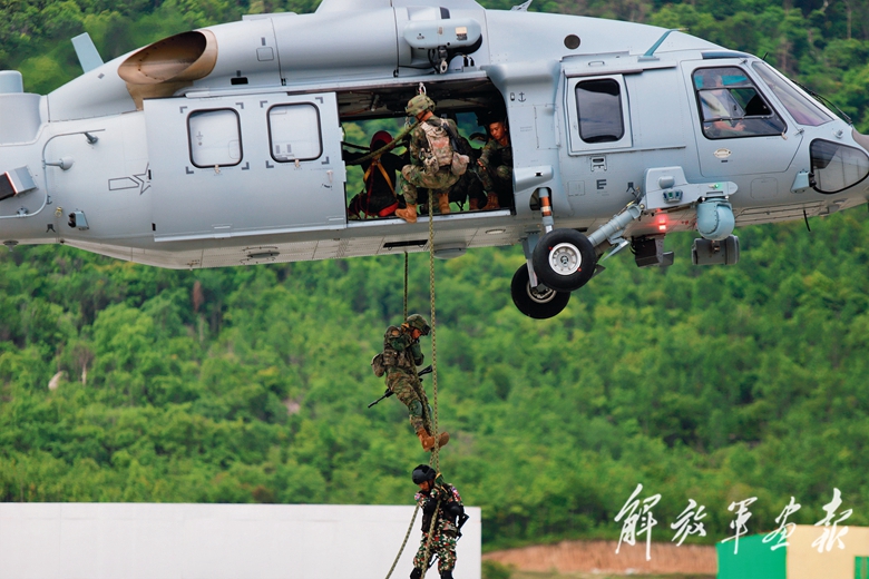 5月23日,中柬雙方突擊隊員實施索降訓(xùn)練。