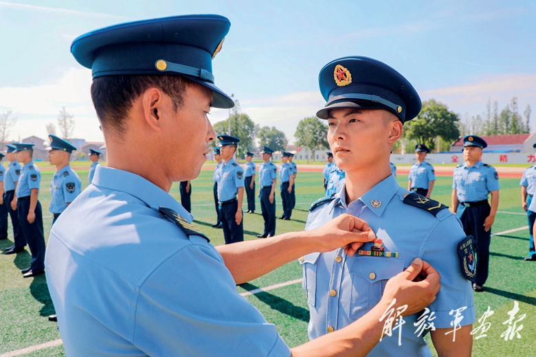 空軍某部開(kāi)展“傳承紅色基因、凝聚奮進(jìn)力量”主題黨日活動(dòng)。圖為二級(jí)軍士長(zhǎng)蔡彥龍(前左)為新黨員佩戴黨員徽章。(攝影/朱海濤)