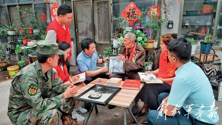 山東省棗莊市臺(tái)兒莊區(qū)人武部和退役軍人事務(wù)局工作人員來(lái)到95歲高齡的老兵武之權(quán)家中,聆聽(tīng)他講述親歷的戰(zhàn)斗故事。(攝影/惠繼萌)
