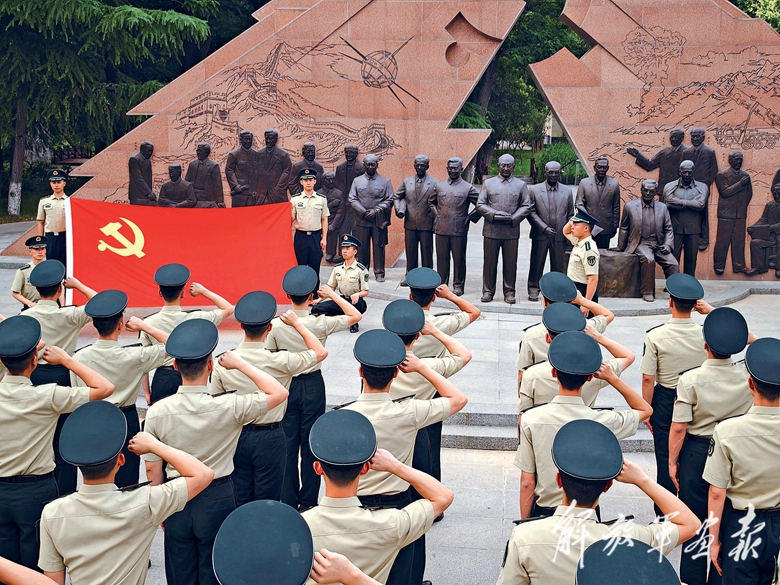 火箭軍工程大學(xué)組織即將畢業(yè)的學(xué)員在“兩彈一星”功勛人物群雕前向黨旗宣誓。(攝影/鐘福明)