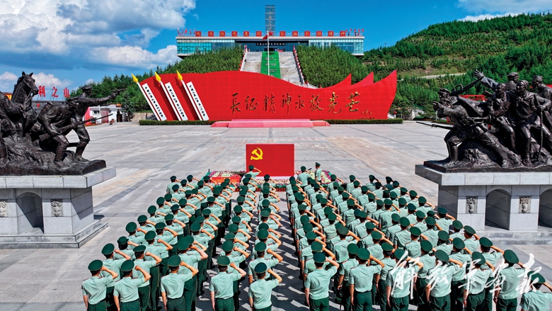 武警第一機(jī)動(dòng)總隊(duì)某支隊(duì)組織黨員在六盤(pán)山紅軍長(zhǎng)征紀(jì)念館前重溫入黨誓詞。(攝影/何小根)