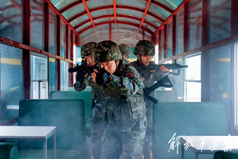 李興坤(前)帶領(lǐng)小隊進行火車反劫持訓練。
