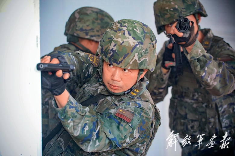 李興坤(右二)與特戰(zhàn)隊員進行山林地捕殲戰(zhàn)斗訓練。