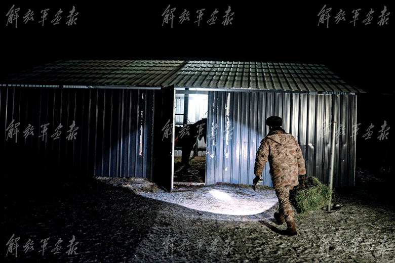 深夜,一名戰(zhàn)士去喂軍馬。