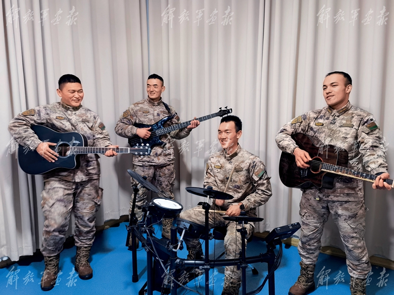 連隊(duì)“雪絨樂隊(duì)”成員利用休息時(shí)間排練歌曲。