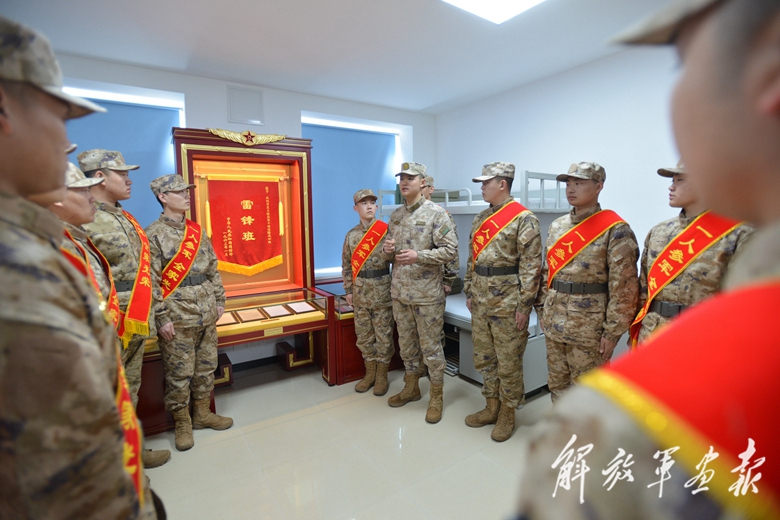 組織預(yù)定新兵到“雷鋒班”開展現(xiàn)地教育,“雷鋒班”原副班長蔣辦(右三)講述雷鋒故事。