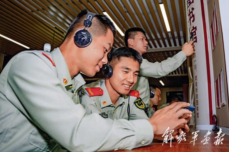 4月17日,武警廣西總隊玉林支隊官兵在“有聲圖書館”聽書。(攝影/賴成龍)