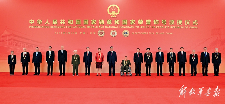 9月29日,中華人民共和國(guó)國(guó)家勛章和國(guó)家榮譽(yù)稱號(hào)頒授儀式在北京人民大會(huì)堂金色大廳隆重舉行。習(xí)近平等領(lǐng)導(dǎo)同志同國(guó)家勛章和國(guó)家榮譽(yù)稱號(hào)獲得者合影留念。 (攝影/新華社記者 李學(xué)仁)