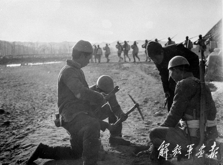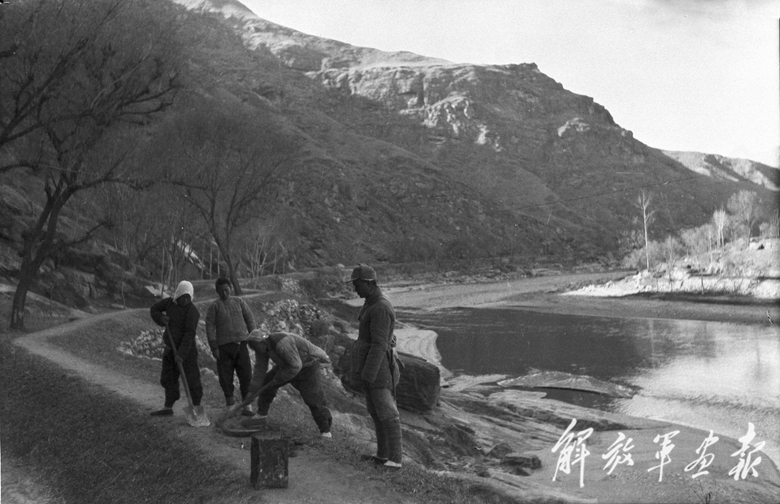 晉察冀邊區(qū)民兵在敵人將要經(jīng)過的河灘上埋地雷。(攝影/石少華 本刊資料室提供)