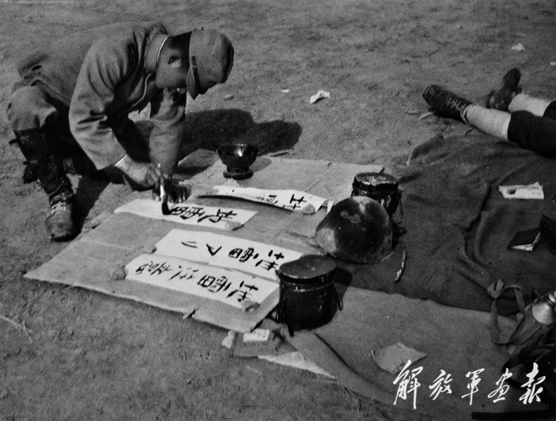 這是我軍繳獲日軍拍攝的照片,圖為一名日軍在書寫“注意地雷”的標(biāo)語。(本刊資料室提供)