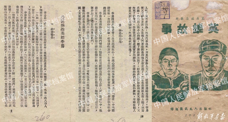 1944年華北軍區(qū)編印的《英雄故事》封面及李勇事跡內(nèi)頁。(中國人民解放軍檔案館提供)